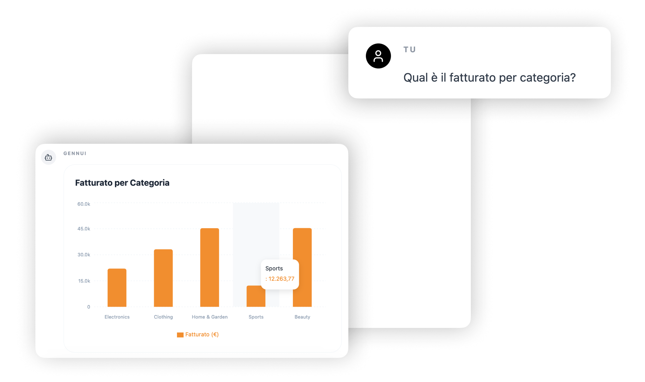 Accedi ai dati aziendali in secondi, non ore. Chiedi un report e lo ottieni istantaneamente. Prendi decisioni basate sui dati molto più velocemente dei tuoi competitor.