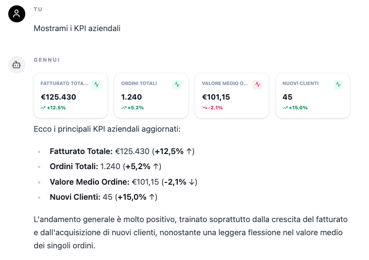 Non limitarti a leggere testo. Genn fonde linguaggio naturale e componenti interattivi: può rispondere con un grafico, una tabella o un pulsante, scegliendo ogni volta lo strumento più efficace per farti agire.